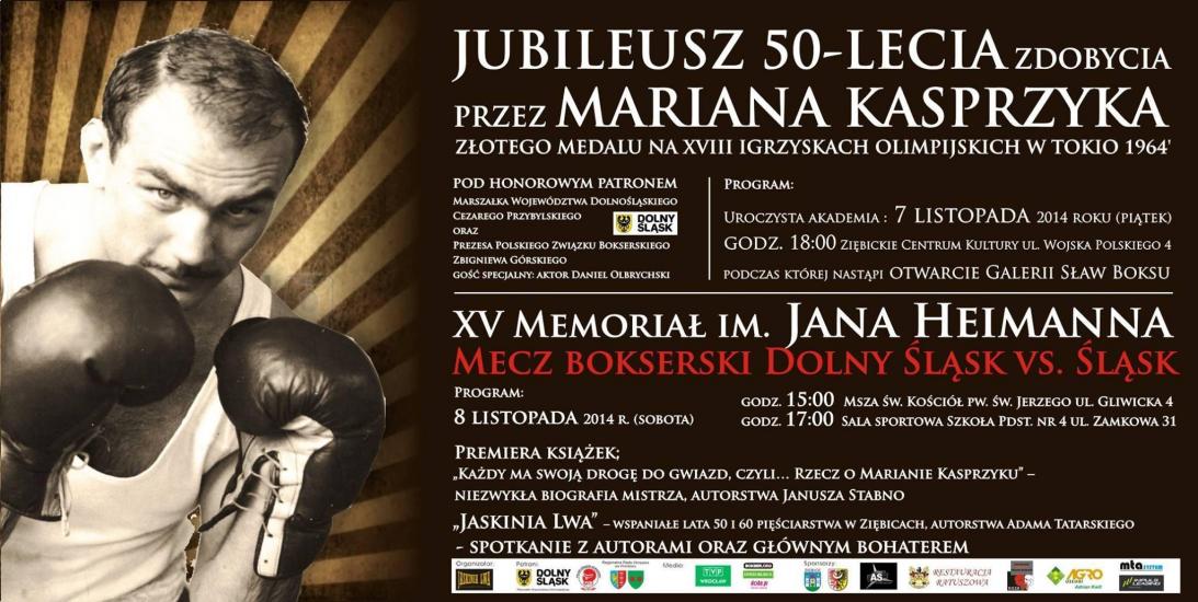 Zapraszamy wszystkich na memoriał przy okazji którego odbędzie się mecz bokserski oraz jubileusz naszego trenera, mistrza olimpijskiego Mariana Kasprzyka. To już 50 lat minęło odkąd w '64 w Tokyo, reprezentując nasz kraj wywalczył złoty medal na olimpiadzie.